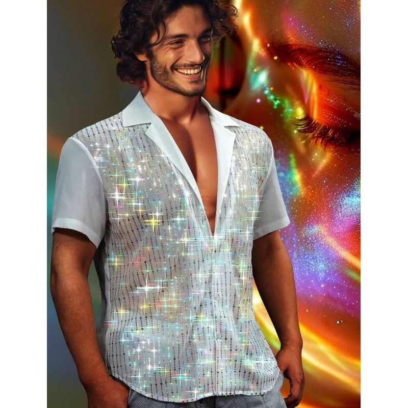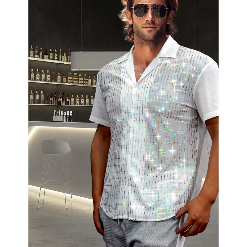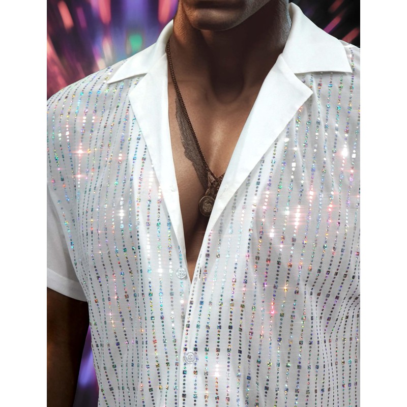 AIBEIX Mens Mesh Sequins See Through 70s Disco Short Sleeve Button Down Shirts(White,Medium)