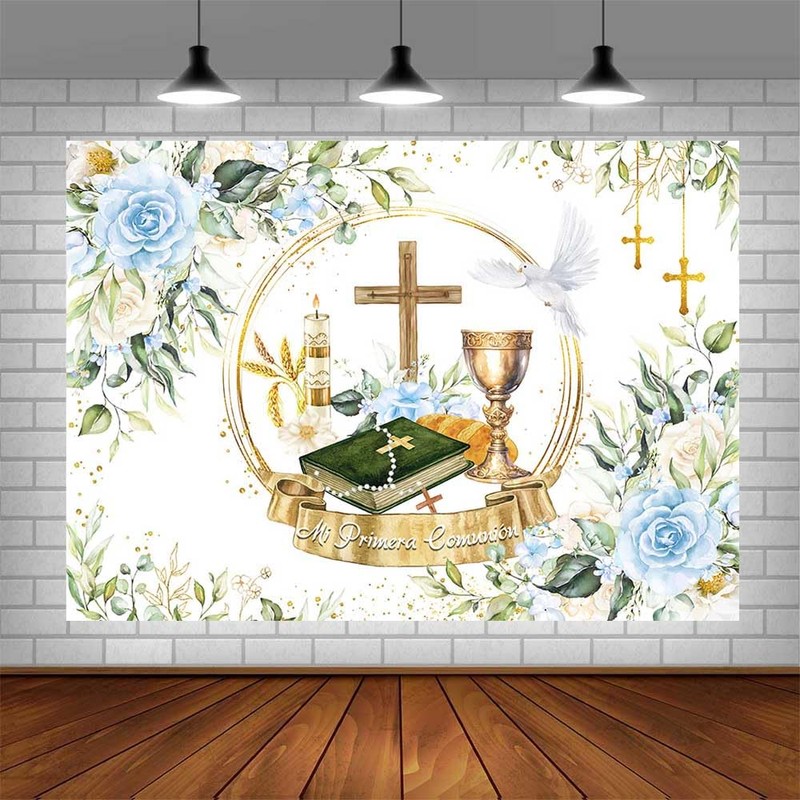 AIBIIN 7x5ft Mi Primera Comunión Backdrop Baptism Backdrop Decorations First Communion Decorations Primera Comunion Decoraciones Blue Floral Pampas Photo Studio Props