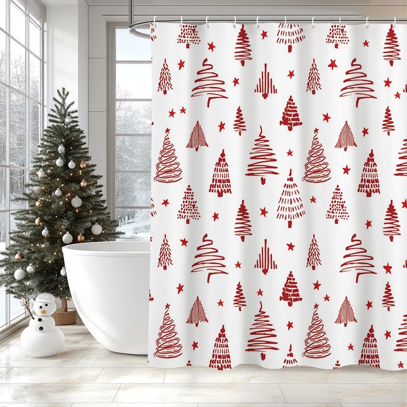 AIBIIN Christmas Shower Curtain Red Xmas Tree Stars Bath Curtains New Year Holiday Decor for Bathroom Durable Polyester Material with 12 Hooks 180x180cm