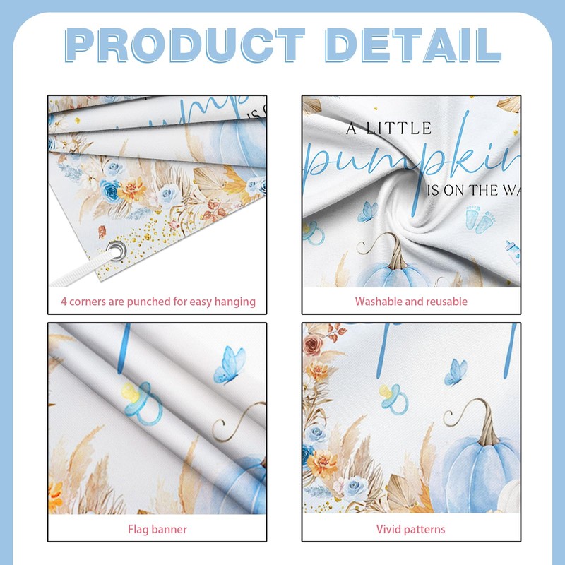 - Premium Material: This a sweet little pumpkin is on the way backdrop is made of high quality polyester, which is sturdy and durable, tear-resistant, great for newborn boy baby party decorations. The color is vibrant, the pattern is clear printed and fade-resistant. It is reusable and washable, which can be stored for next time use