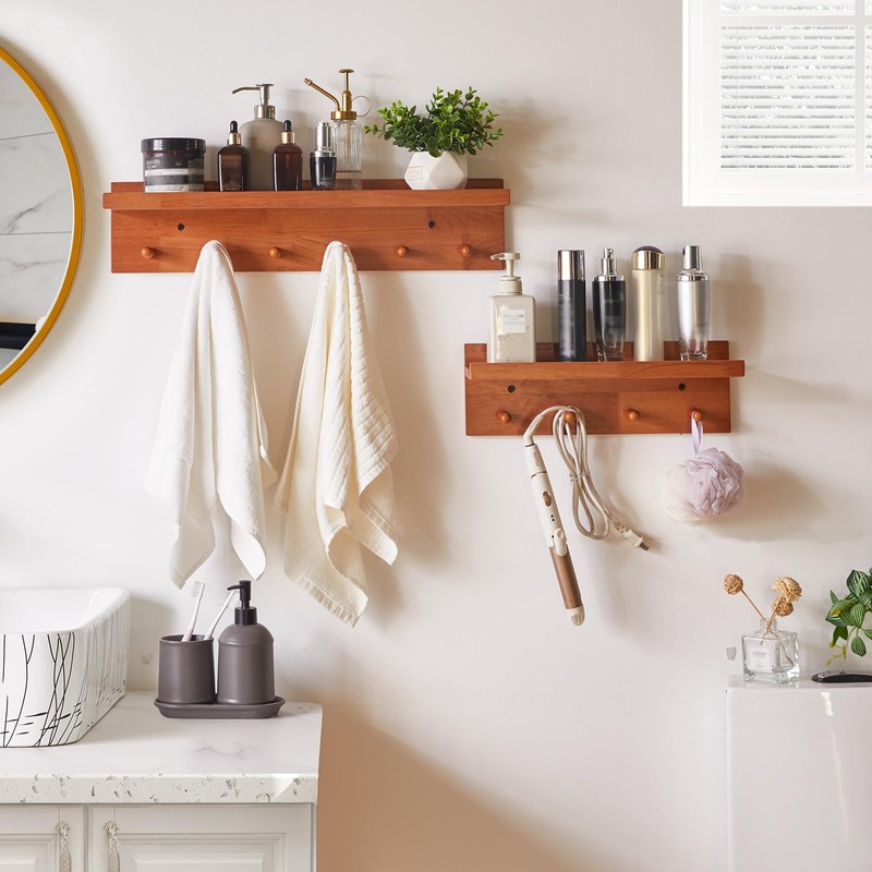- Versatile storage solution: Solid wood hooks can be used to hang keys, bathrobes, aprons or flower baskets. Shelves can be used to display decorative items, store toiletries or organize spices. Wall-mounted coat hooks are suitable for farmhouse, modern or industrial styles