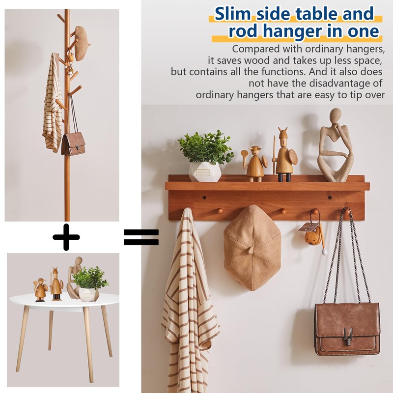- Premium Solid Wood Construction:Crafted from 100% natural solid wood with smooth eco-friendly coating, this wall hook shelf resists warping and moisture damage. Built to hold up to 11.02lbs for coats, towels, or kitchenware