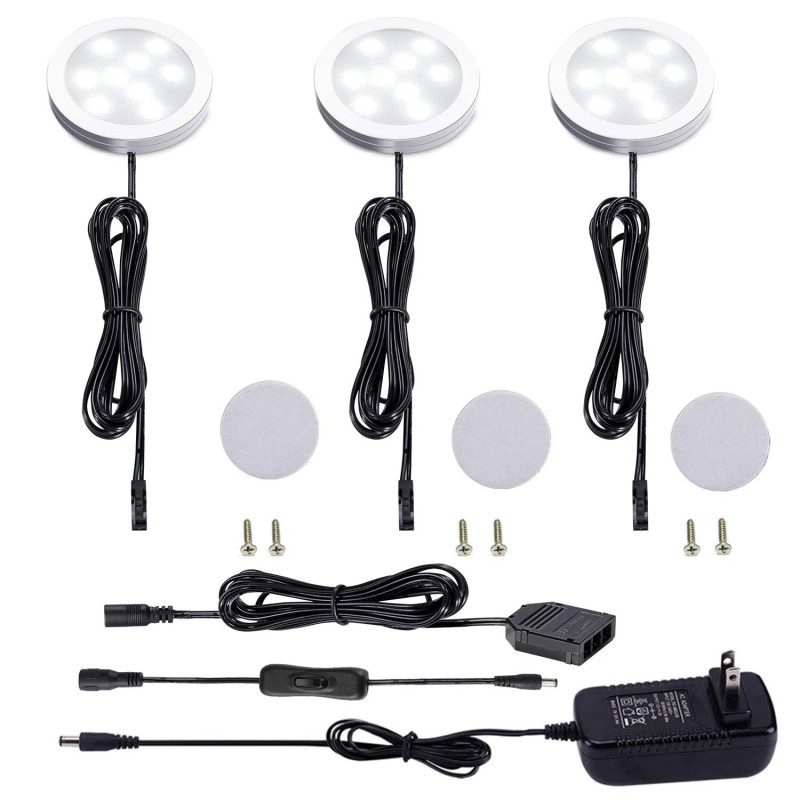 - # READY TO USE & EASY TO INSTALL: Coming with 3 LED puck lights, 1 x power adapter wall plug with switch, 3 x double adhesive tapes and 6 x screws.