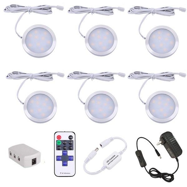 AIBOO Dimmable LED Under Cabinet Lighting, Counter Showcase Kitchen Lighting Fixtures with 12V Plug in adapter and Dimmable Wireless Remote Control, 6 Ultra Slim Puck Lights Kit (Warm White)