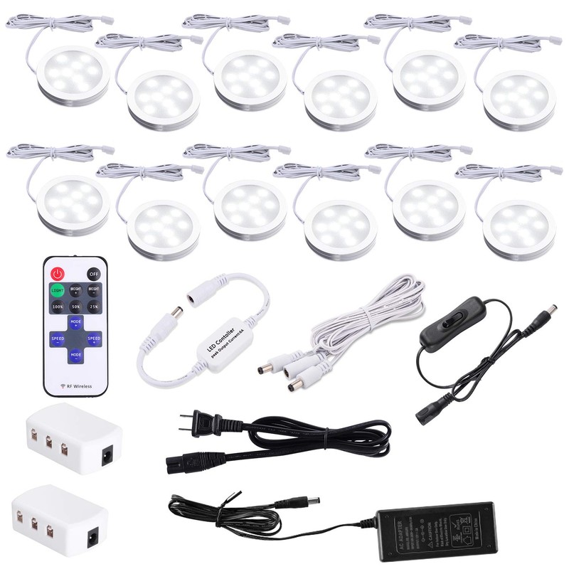 AIBOO LED Under Counter Lighting,Curio Cabinet,Display Light Fixtures with 12V Plug in Adapter and Dimmable Wireless Remote Control,24W 12 pcs Ultra Slim Bright Puck Lights(6000K, Daylight White)