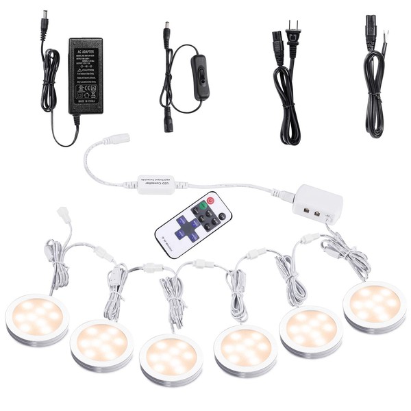 AIBOO Linkable Under Cabinet LED Lighting 12V Dimmable Puck Lights with Wireless RF Remote Control, Hardwired & Wall Plug in for Counter Lighting(6 Lights, Warm White)