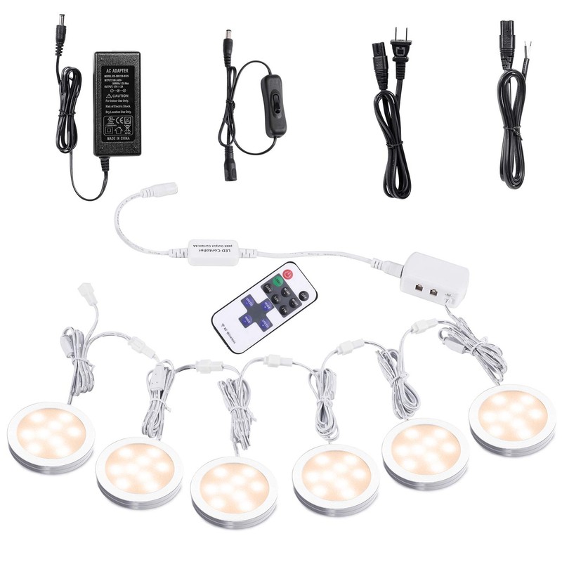 **Linkable Under Cabinet LED Puck Lights Kit Wall Plug In & Hard Wired Wireless RF Remote Control for Kitchen Counter Closet Accent Lighting** **@ 2-WAY INSTALLTIONS** There can be 2 ways of installations: 1) Wall plug in. 2) Hardwired. The user can easily choose one way to install according to the requirement. **@ LINKABLE CONNECTION** This creative design of LED under cabinet lighting kit is different from most under cabinet lights kit which normally use a distributor to achieve parallel connections. This set of lights can be self linking, can be connected in both ways: series connection and parallel connections. **@ DIMMABLE** With a 12V mini RF remote controller, the lights can be easily turned on and off and dimming from 0% to 100%. **@ INVISIBLE** Low profile aluminum alloy lamp shell which makes the puck light can hardly been inspected after installation until turned on. **@ MULTI-FUNCTIONAL USAGE** Suitable for household and residential application like kitchen, under counter, closet, wardrobes, cupboards, dresser, wall, ceiling, cabinet, desk, bed, table, drinks(liquor) cabinet, wine racks, wine cellars, bar counter, TV cabinets, china cabinets, etc. **@ SAFE AND SECURE** UL listed power adapter, 100-240Vac input, 12Vdc output, safe for touching. **@ PACKAGE INCLUDED** 6 x 12V LED under cabinet puck light 1 x LED hardwired transformer with wall plug in (AC120 to DC12V) 1 x Distributor 1 x Wireless RF remote controller (including a receiver and a remote) 2 x Extension cable (5ft) 6 x double adhesive sticker 12 x Screw **@ EXTENSION CABLE** Should you need more extension cords, please refer to the ASIN #B06XG7J9W2. **@ REMOTE CONTROL** Should you need extra remote control sets, please refer to the ASIN #B01M7TGZ9B.
