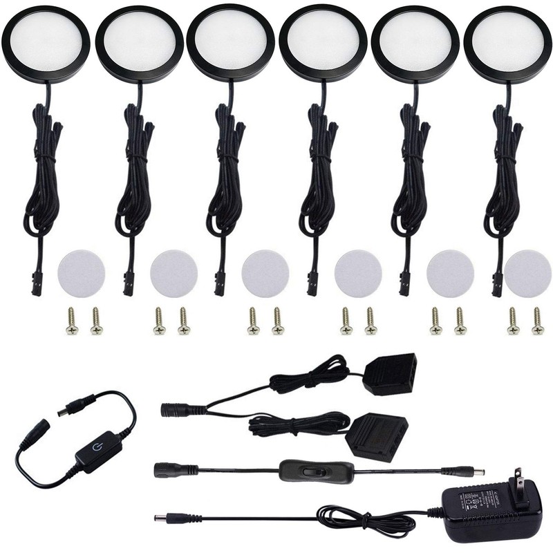 AIBOO Under Cabinet LED Black Cover Puck Lighting Kit with Touch Dimmer Switch for Kitchen Cupboard Closet Lighting (6 Lights,Daylight White)