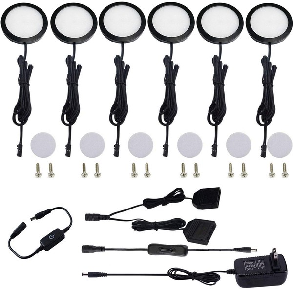 AIBOO Under Cabinet LED Black Cover Puck Lighting Kit with Touch Dimmer Switch for Kitchen Cupboard Closet Lighting (6 Lights,Warm White)