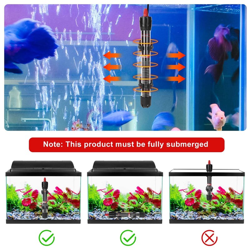- Easy to Install It comes with 2 strong suction cups in the package, you can mount it at any angle, just make sure it is completely submerged in water. Aquarium heater automatically turns on or off after setting the desired temperature, no additional adjustment is required. Intelligent heating with constant temperature that provides your fish with a safer and more comfortable environment.