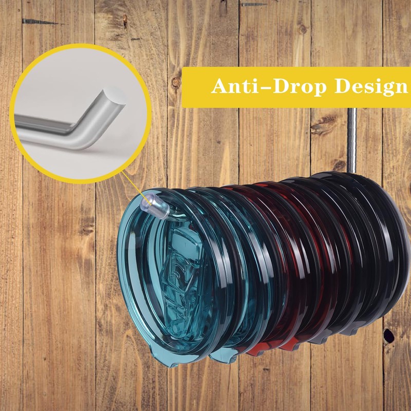 - 【Premium Quality】These Tumbler lid hook is made of stainless steel, strong enough. Comes with strong adhesive tapes and screws, ensuring quick installation and use. Ensuring your tumbler lids stay neatly organized.Say goodbye to mess and find the tumbler lid replacement you need within seconds.