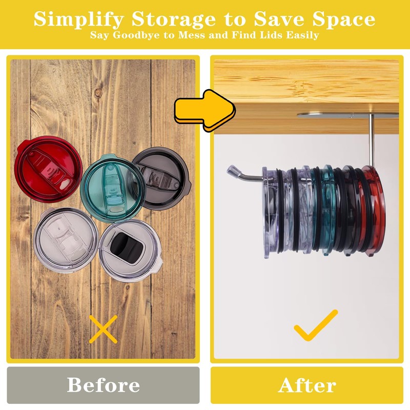 - 【Space Saving Lid Organizer】Tumbler lid organizer is different from regular tumbler lid storage.It features a convenient installation under the cabinet/on the wall, which will not take up your countertop space and guarantee a tidy kitchen.