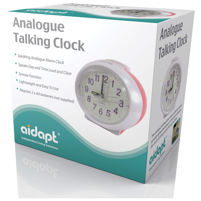 This Aidapt analogue talking alarm clock is ideal for none or partially sighted individuals. Fitted with easy to read large numbers on a luminescent background, at the push of a button this clock will clearly speak the day and time in English, also features an alarm and snooze function.