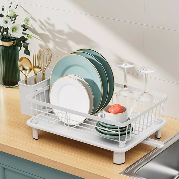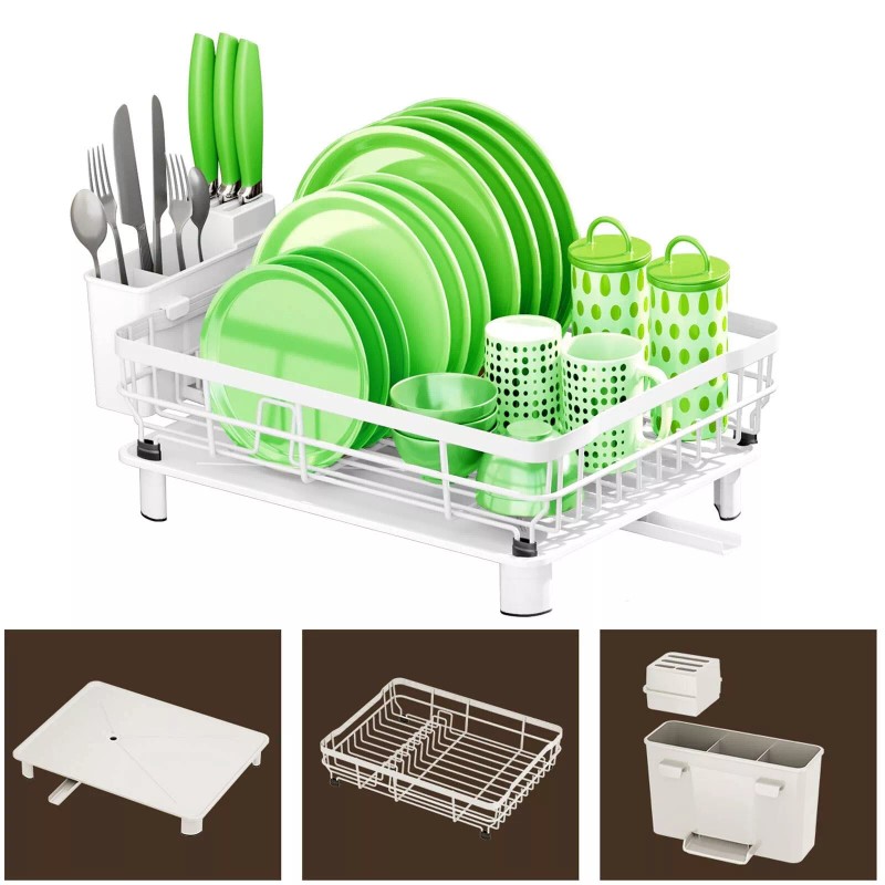 Extendable Swivel SpoutThe drain pipe is detachable and also can be rotated 360Β° to fit any side of the sink's drainage needs , the spout that goes into the sink doesn't leak onto your countertop | Movable Cutlery BoxThe utensil holder is removable if it needs to be cleaned or moved to a different part of the drying rack. You can put your knifes in there with the pointy sharp down | Anti-slip Drainborad FeetTwo-inch feet on the drain tray - it's nice to get the drain tray off the countertop and let air circulate underneath. The elevated drain pan allows for easy cleaning under the rack, no worry about moisture build up and mold |