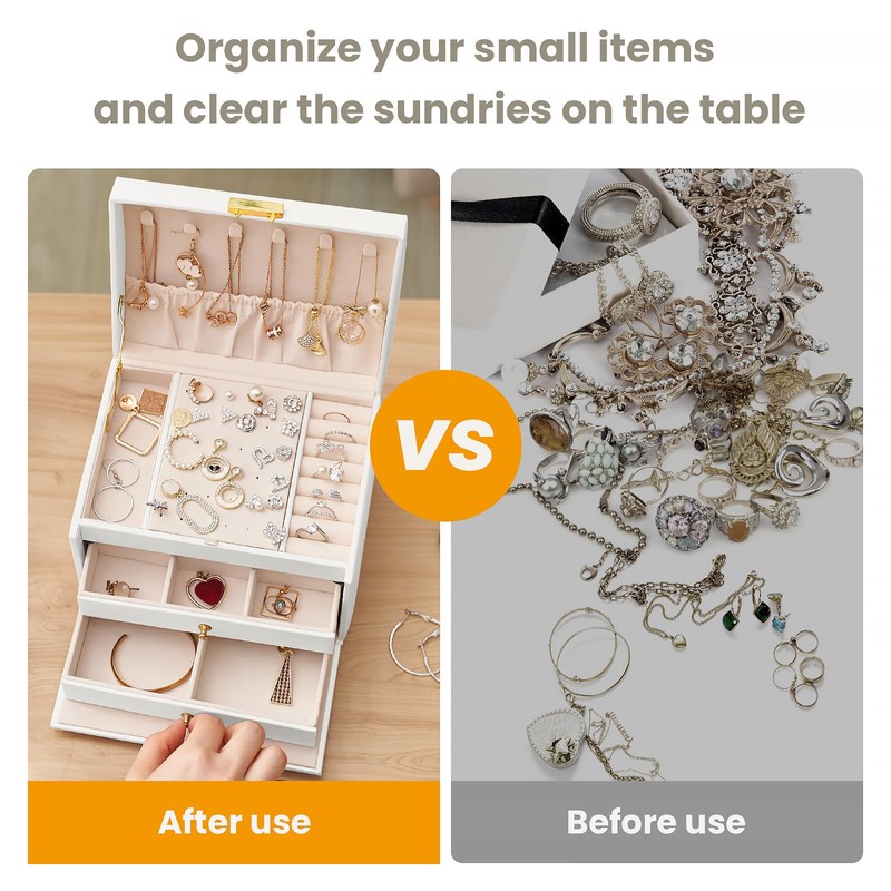 - Multi-purpose jewellery case: multi-layer storage of stud earrings, earrings, necklaces, bracelets, lipsticks, bracelets, anklets, watches and other jewellery. Removable dividers are appropriately divided for easy storage.