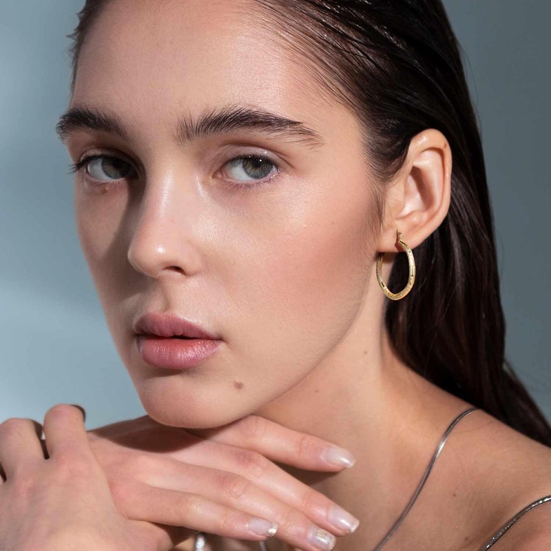 Introducing the epitome of luxury and style - our 14k gold hoop earrings for women. Every woman deserves a piece of gold jewelry that not only complements her style but also stands as a testament to her unique persona. These large gold hoop earrings for women are designed to be that exact piece. Measuring at a distinct 30mm in diameter, these gold hoop earrings 14k gold earrings hoops bring a majestic aura to the fore. Their generous 4.7mm thickness further augments these 14 karat gold hoop earrings grandeur, providing a robust and opulent feel. Aesthetically, the design speaks volumes. The perfectly rounded structure, synonymous with timeless charm, is coupled with a sumptuously thick build, sometimes referred to as chunky hoop earrings, ensuring these thick gold рlаtеd hoop earrings are not just another accessory but a statement piece. But what truly sets them apart is the meticulous V-shaped dense engraving on their surface. Each engraving is crafted with precision, making these 14k gold earrings for women’s hoop earrings shimmer and dance, reflecting light in an enchanting and ever-changing pattern. Practicality is not sacrificed for beauty. The secure latch backing is ingeniously designed, ensuring that these 14k gold hoop earrings remain snugly and safely in place. Additionally, it allows for effortless wearing and removal, eliminating the often cumbersome process associated with many big hoop earrings.