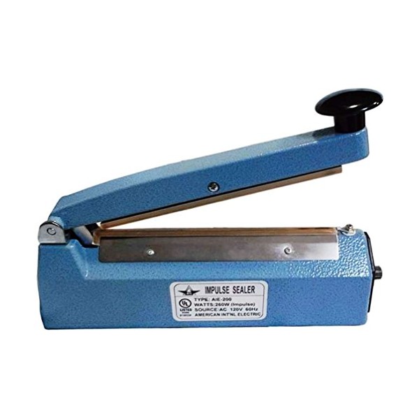 AIE AIE-200 Impulse Handheld Bag Sealer, 8" Max. Seal Length, 2 mm Seal Width, 350 Watts, Exceptional air and watertight seals on most plastic materials up to 6 mil, Food and non-food applications
