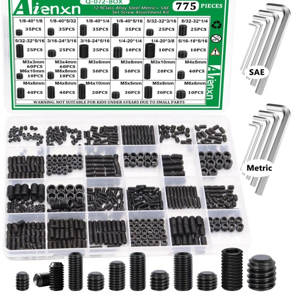 Aienxn 775PCS Metric +SAE Set Screw Assortment Kit Hex Socket Head Cup Point Set Sc