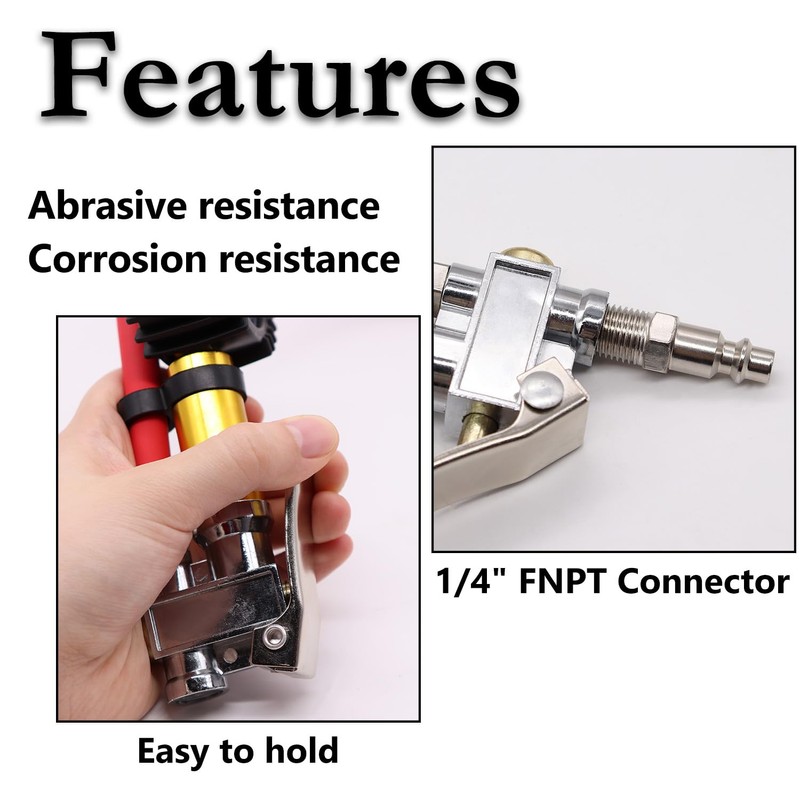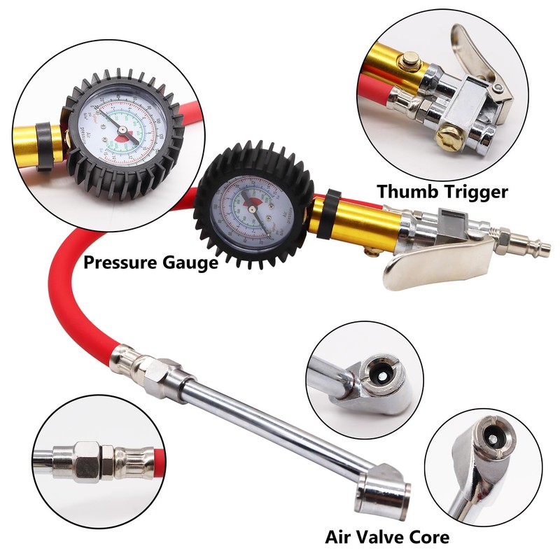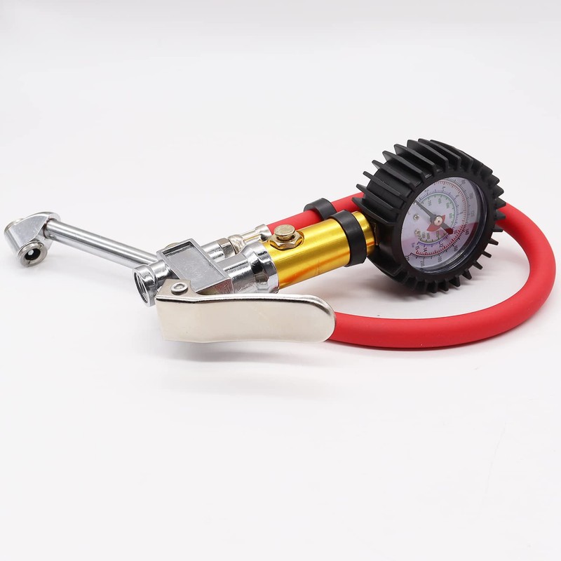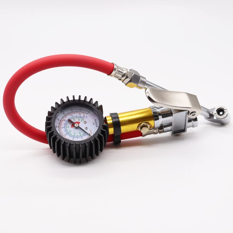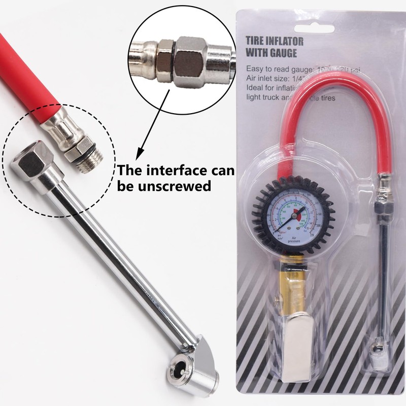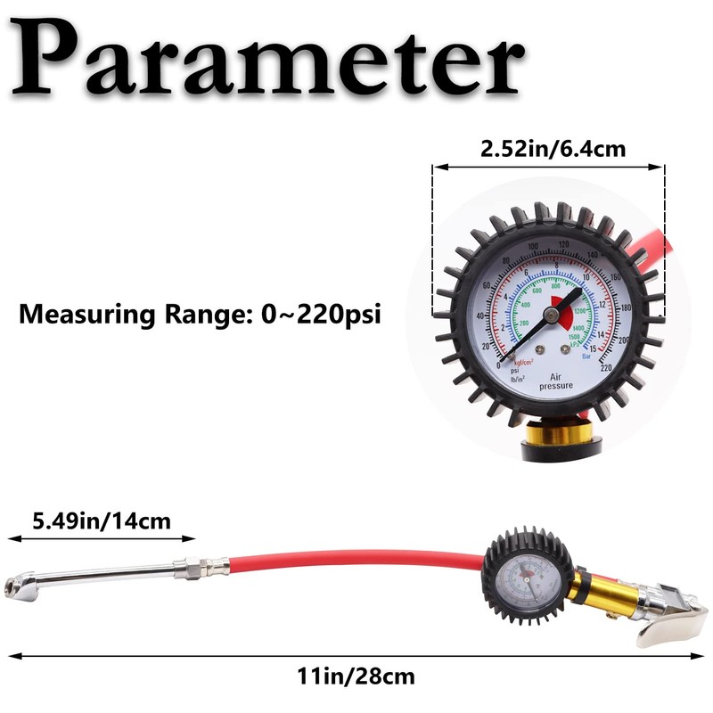 - Features: Aienxn tire pressure gauge is wear-resistant, corrosion-resistant and easy to operate. This tire inflator with pressure gauge is equipped with a clear and easy-to-read display dial with a pressure gauge of 0-220 psi. The dial is surrounded by a large rubber shell to provide extra protection and durability. Straight-on air chuck inflator is attached to flexible rubber hose.