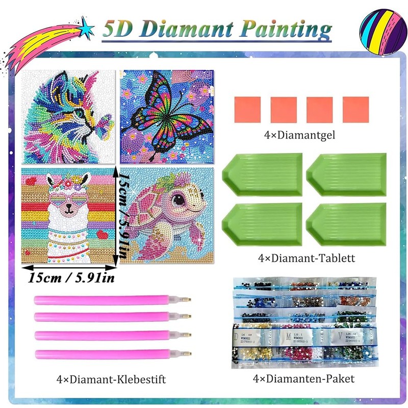 Aieraczy Pack of 4 5D Diamond Painting Pictures Children, Diamond Painting Full Set, Diamond Painting Animals Small, DIY Diamond Painting, Crafts Girls 6-12 Years, for Gift Boys, Adults