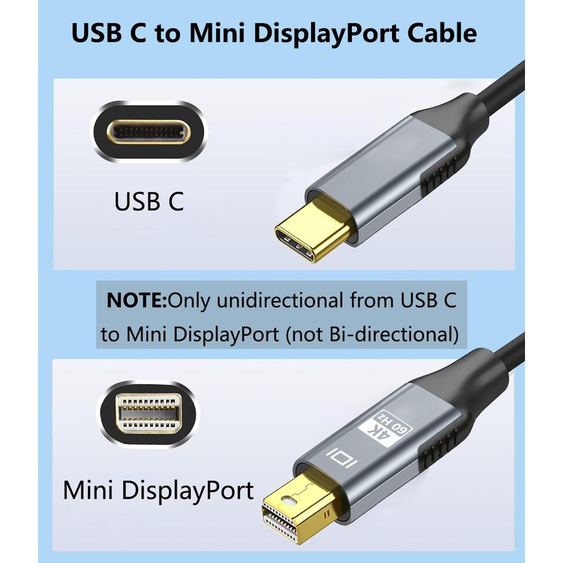 - ✅【Please Note】4K Thunderbolt 3 to Mini DisplayPort cable is not bidirectional, and it cannot work as a monitor from Mac (Mini DP) to MacBook (USB-C). Important notes: This USBC to Mini DisplayPort cable is Not compatible with Thunderbolt /Thunderbolt 2 port devices, such as old MacBook, MacBook Air, MacBook Pro, iMac, audio interface or hard drives with Thunderbolt/Thunderbolt 2 Port.