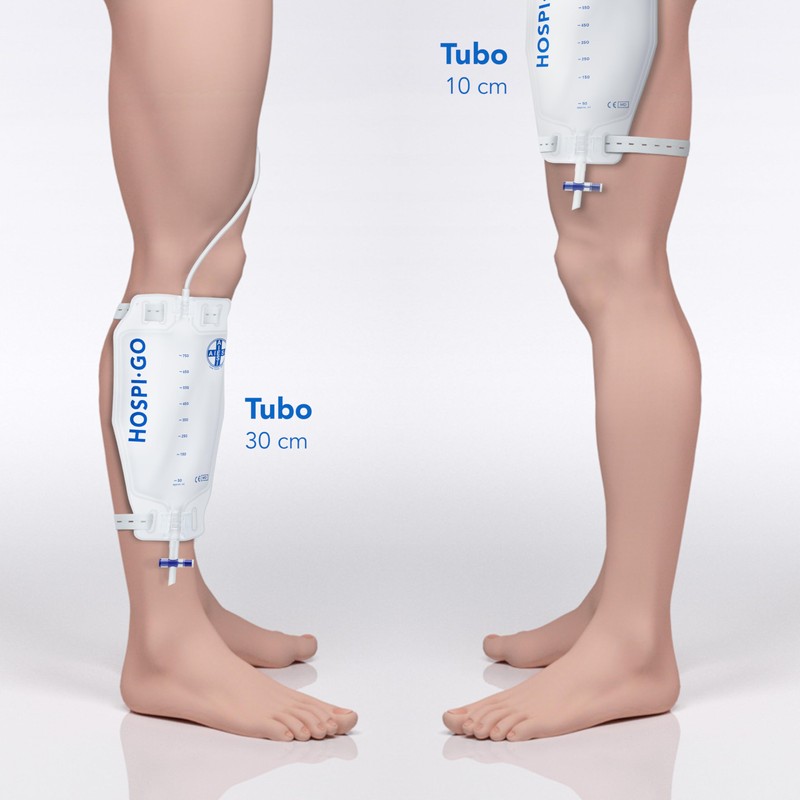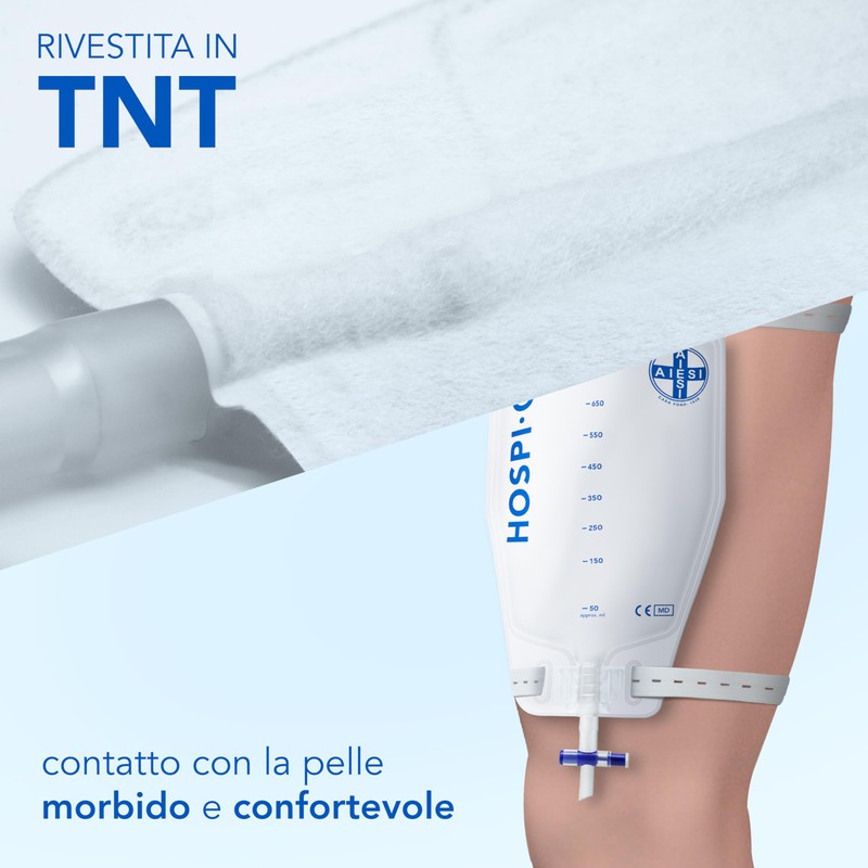 - HOSPI-GO anatomical heat-sealed bags made of flexible medical grade PVC with graduated scale and predisposition for attachment, equipped with drain tap, anti-reflux valve and elastic bands. The part that comes into contact with the skin is covered with TNT, while the double circumferential welding guarantees maximum safety by preventing leakage of liquids. Latex free product
