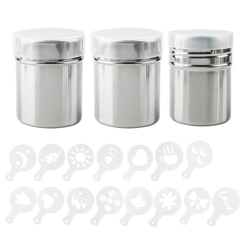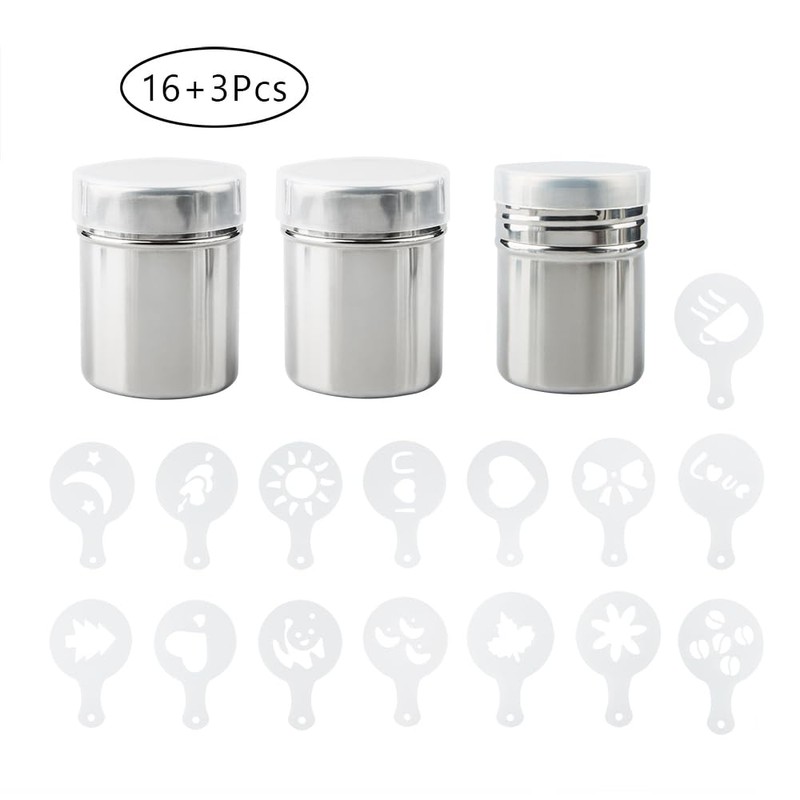 AIFUDA 3 Pack Stainless Steel Powder Shaker with 16 pcs Printing Molds Stencils, Powder Cans with Mesh for Coffee Cappuccino Latte, Dredge Shaker with Hole for Kitchen, Restaurants