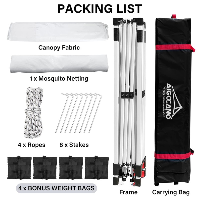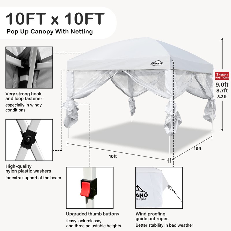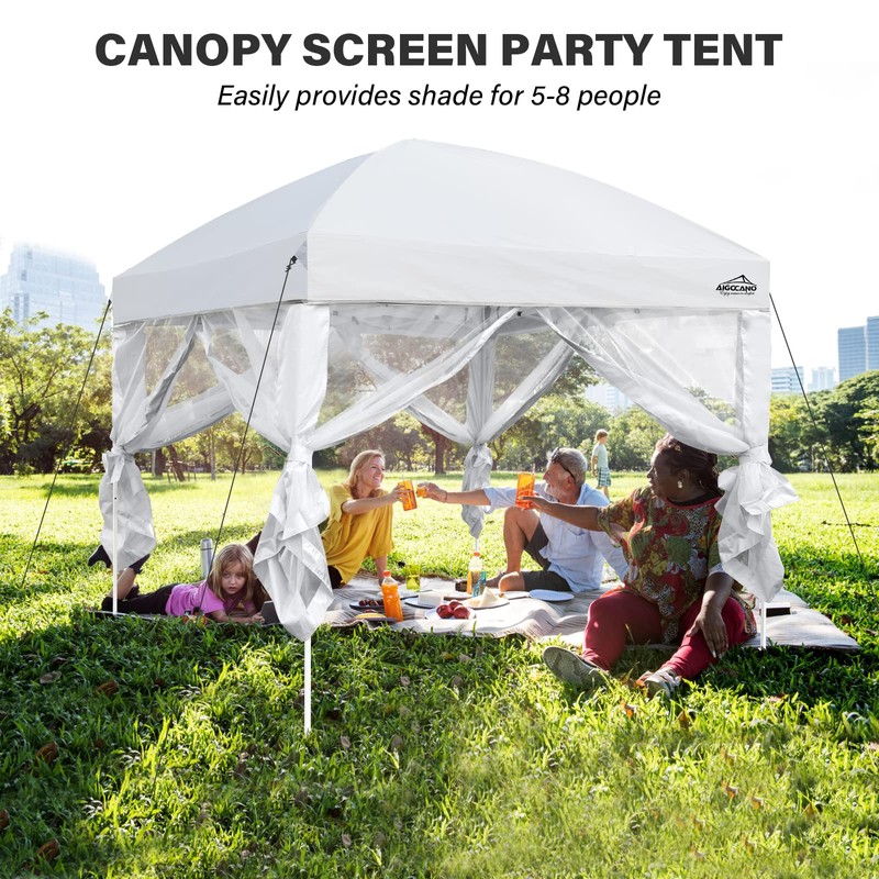 AIGOCANO Canopy Tent with Netting Screen,10x10 Easy Pop Up Gazebo for Outdoor Parties,Camping,Foldable Patio Gazebo with Roller Bag and 4 Sandbags (White)