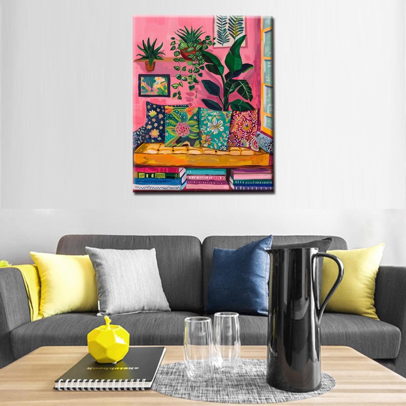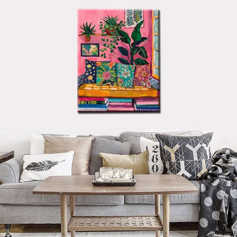 Aihonmin Pink Reading Book Room Paint by Numbers Kits for Adult Paint by Numbers Soft Hues Boho Style Painting Kits Painting Art Gift on Canvas Perfect for Gift Home Wall Without Framed 16''W x 20''H