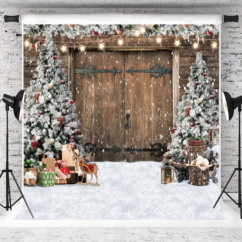 AIIKES 10x10FT Christmas Backdrop Winter Christmas Rustic Barn Wood Door Photography Backdrop Xmas Tree Snow Gift Family Holiday Party Decor Backdrop Photo Studio Props 12-630