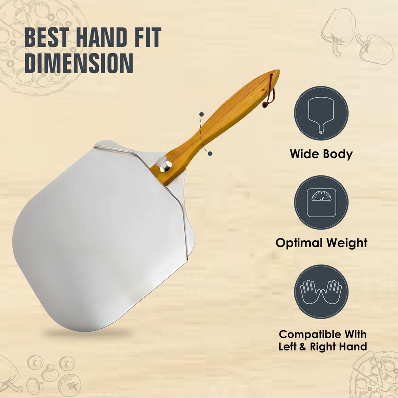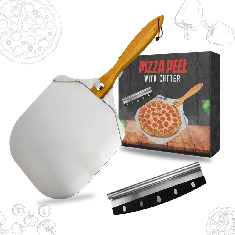 - 🍕PACKAGE INCLUDES - You will get 1x Aluminium Pizza Peel and 1x Pizza Cutter. Our 12 inch pizza peel with wooden handle offers a comfortable grip and prevents heat transfer and overheating.