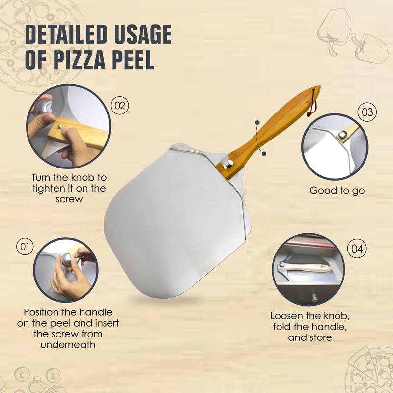 - 🍕SIMPLE STORAGE - This aluminum pizza peel is unique in its design. When you're done, simply fold the handle up and store to stave space. Use this baker’s pizza paddle peel for indoor or outdoor ovens.