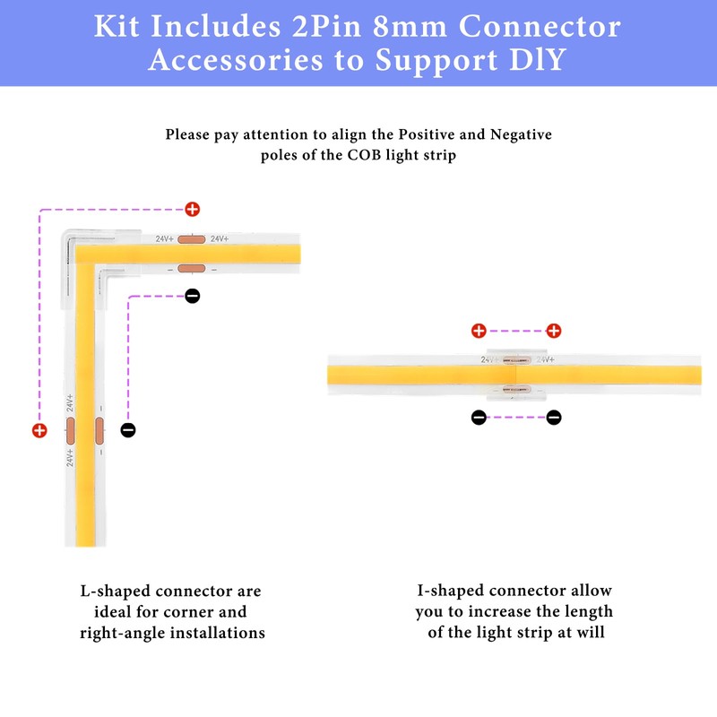 - For those who prefer a simpler method: We provide 4 L-connectors and 4 I-connectors. Whether you're a beginner avoiding soldering or a pro looking to save time, these connectors are the ideal solution. Simply push the strip into the connector, ensure both sides match in polarity, and gently squeeze with pliers for a secure and efficient installation. Use them to create right angles, extend your strips, and design the ideal lighting layout for your DIY projects