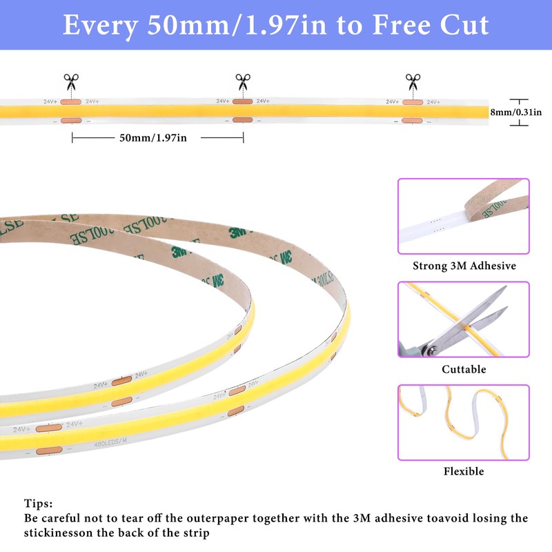 - Customizable Length for Any Project: The COB LED strip can be cut every 50 mm (1.97 inches) at marked points, allowing you to customize the length to fit any space. After cutting, the strip can be reconnected by soldering at the cut marks