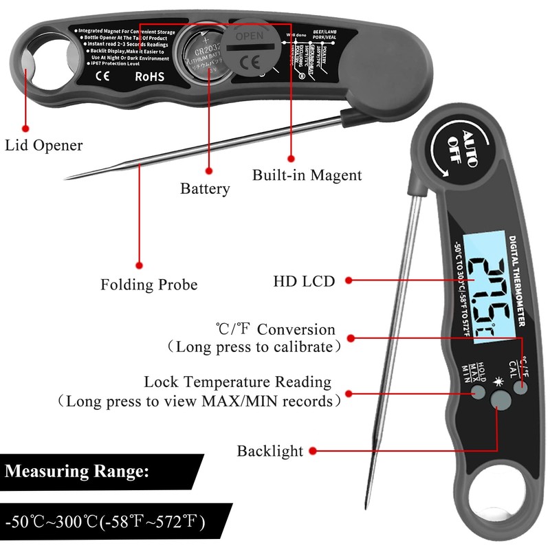 - 【Instant Read & High Accuracy】 The meat thermometer only 2-3 seconds reads the temperature in a wide range of -58℉-572℉ (-50°C~300°C), and the accuracy is up to +/- 1 degree.
