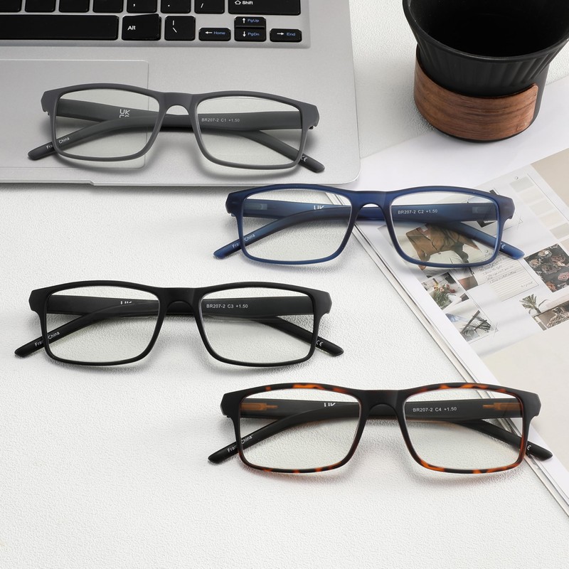 - Reading Glasses for Men: 4 Pairs of rectangular readers in black, grey, blue and tortoise in same magnification strength,extra bonus 1 pouches and 1 microfiber cleaning cloths