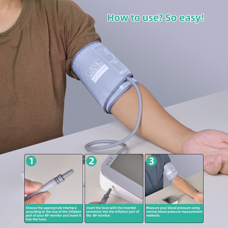- [Easy to install]: We provide high-quality silicone tubing that is both soft and durable. You can easily remove your original blood pressure monitor cuff and attach our cuff, then reconnect it to your blood pressure monitor for blood pressure readings as usual. Of course, you can also use our spare connectors. The AILE blood pressure cuff makes it easier for you to replace worn or damaged arm cuffs.