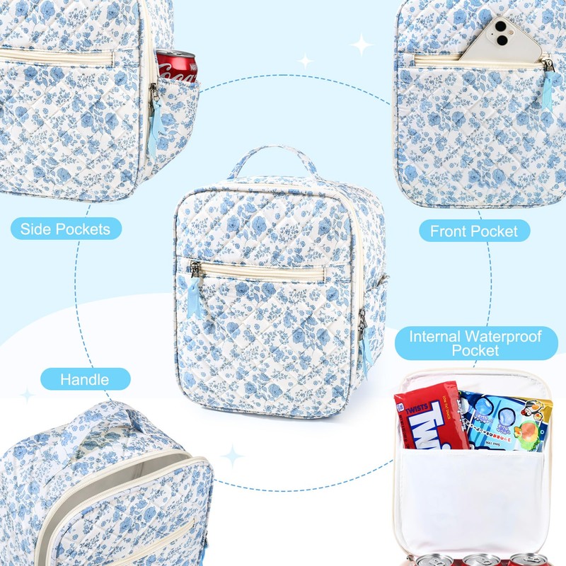 Aileam Lunch Box Lunch Bag for Women Cute Girls Insulated Womens Lunch Bag For Work Quilted Large Capacity Reusable Insulated Cooler for Work School Picnic Travel, Blue Flower