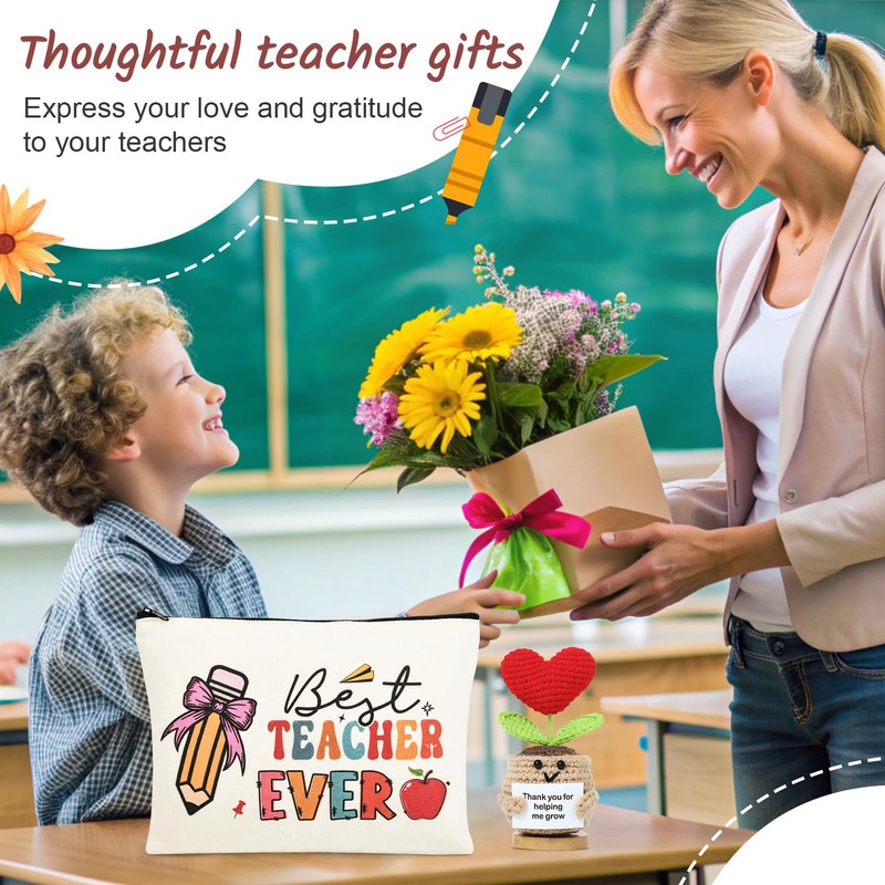 - 💖 Perfect Gift for Teacher's Day: Whether it's for Teacher's Day, graduation, or a thank-you gesture, this teacher gift set has you covered. It includes everything a teacher will love—crochet sunflowers, personalized bookmarks, and a beautiful bracelet—making it a wonderful choice for Teacher Appreciation Gifts.