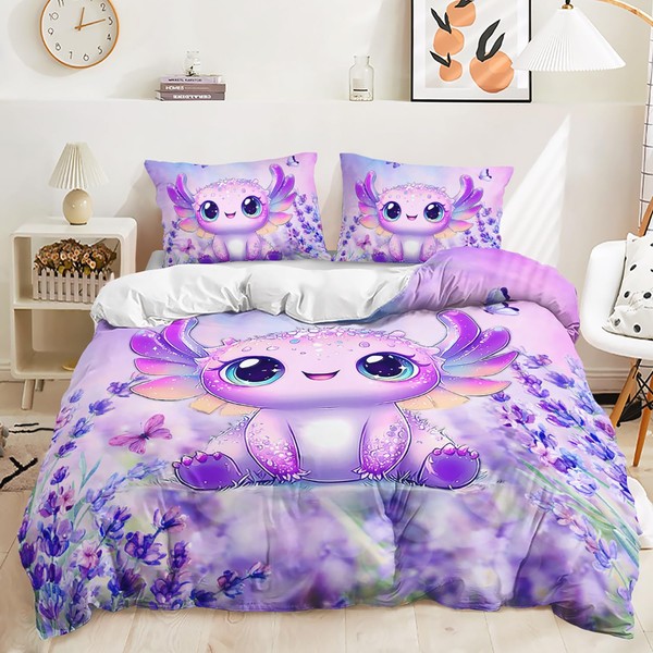 AILONEN Purple Floral Axolotl Duvet Cover Set Twin,Cute Cartoon Lavender Butterfly Axolotl Bedding Set for Kids,Ocean Comforter Cover with 2 Pillowcases,3Pcs