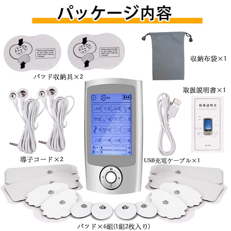 - 【パッケージ内容】本体×1、シリコンパッド×6組(1組2枚入り)、導子コード×2、パッド収納具×2、本体収納布袋×1、USB充電ケーブル×1、取扱説明書×1。