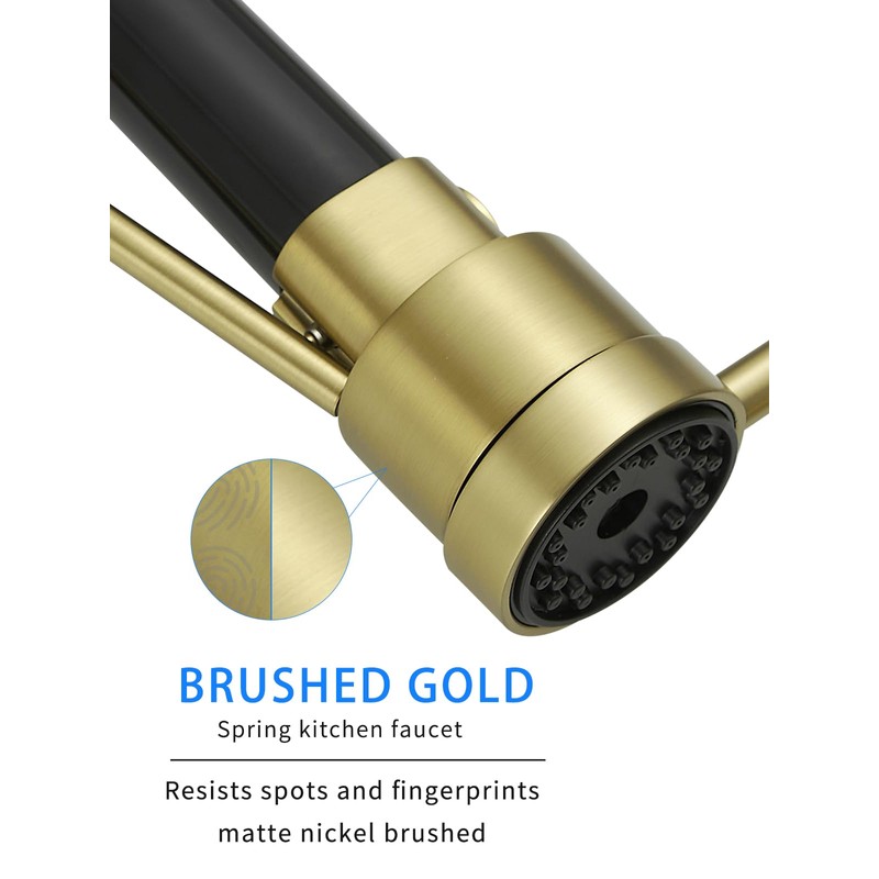 - Heavy-Duty Open Coil Spring Spout: This brushed gold kitchen faucet features a robust open coil spring spout that combines industrial style with exceptional durability. With its downward pull-out nozzle and 360-degree rotating technology, this gold kitchen faucet adapts seamlessly to various tasks, making it ideal for both single and double sinks.