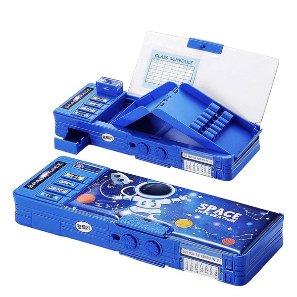 AIMALL 10.6-inch Multi-Functional Pencil Case with Lock, Space Astronaut Design, Whiteboard Writing Board, Built-in Sharpener, Calendar & Storage Compartments for School and Office Use