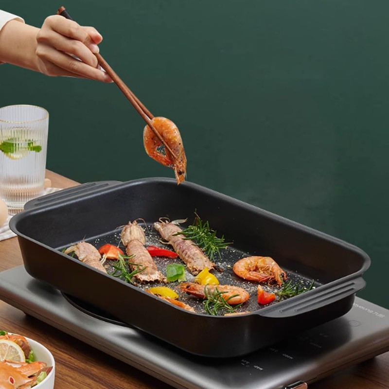• 🧤 Safe Dual Handles for Easy Carrying Without Burning Hands Double-sided handles stay cooler to the touch and offer a stable grip when lifting or moving the tray from stovetop, oven, or barbecue grill.