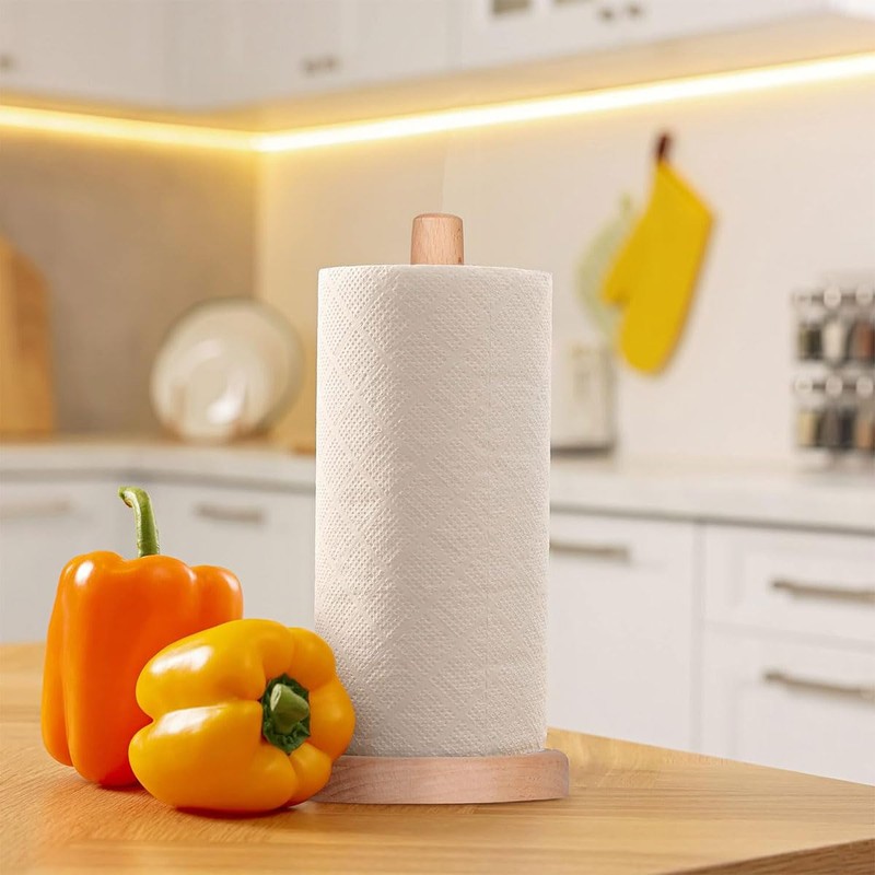 AIMALL Premium Beech Wood Roll Holder, 12.4-Inch Tall Kitchen Paper Rack, Vertical Stand Tissue Holder with Screw Fixation - Durable & Easy Installation