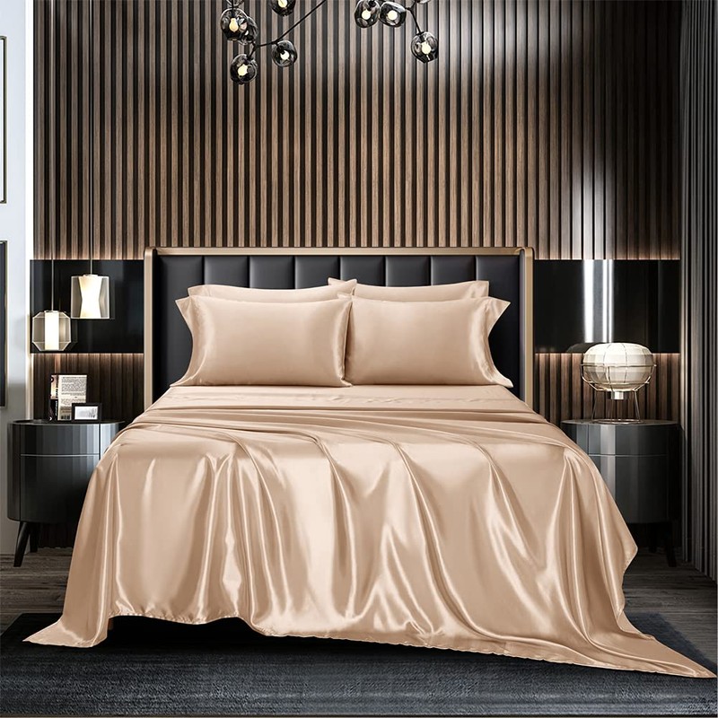 AiMay 6 Piece Satin Pillowcases Bed Sheet Set Deep Pocket Super Soft Luxury Rich Silk Silky Solid Color Stain-Resistant Wrinkle Free (California King, Taupe)