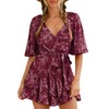 AIMCOO Womens Summer Short Flared Sleeve Romper V Neck Floral Print Jumpsuit Waist Tie Layer Ruffle Hem Dress Look Rompers