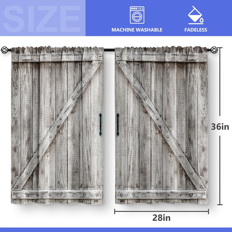 Aimego Wooden Barn Door Kitchen Curtains - Country Wood Farmhouse Rustic Farm Retro Western Cafe Short Tier Curtains Decor for Living Room Rod Pocket Window Drapes 36 Inch Length 2 Panels 28"x36"