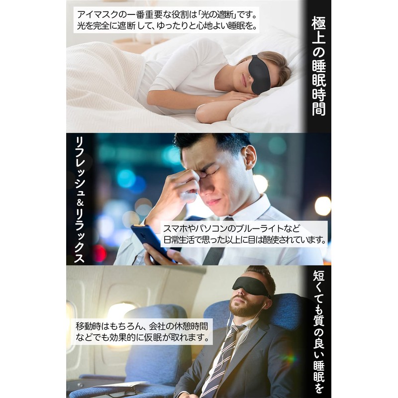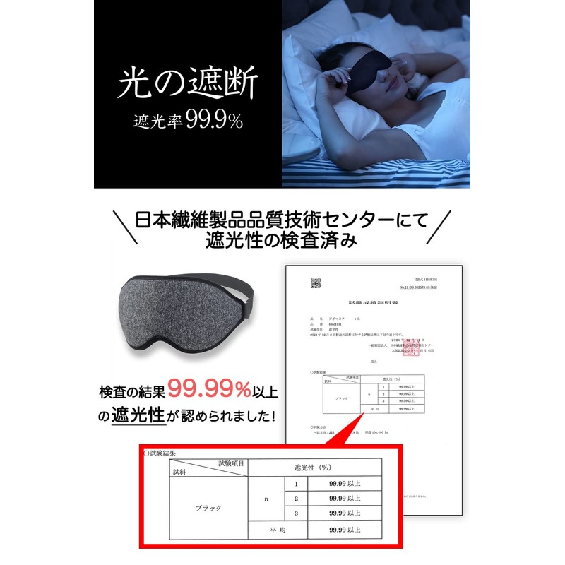 - [Domestically Certified Blocks 99.99%] The most important role of eye mask is to block light. In modern days, it becomes noticeably in dark rooms such as small light while charging or standby power supply, so it is difficult to obtain a dark environment just by turning off the electricity and even if the light is turned off, your eyes will become accustomed to the feeling of light. When choosing an eye mask, it is important to be aware of the light blocking rate