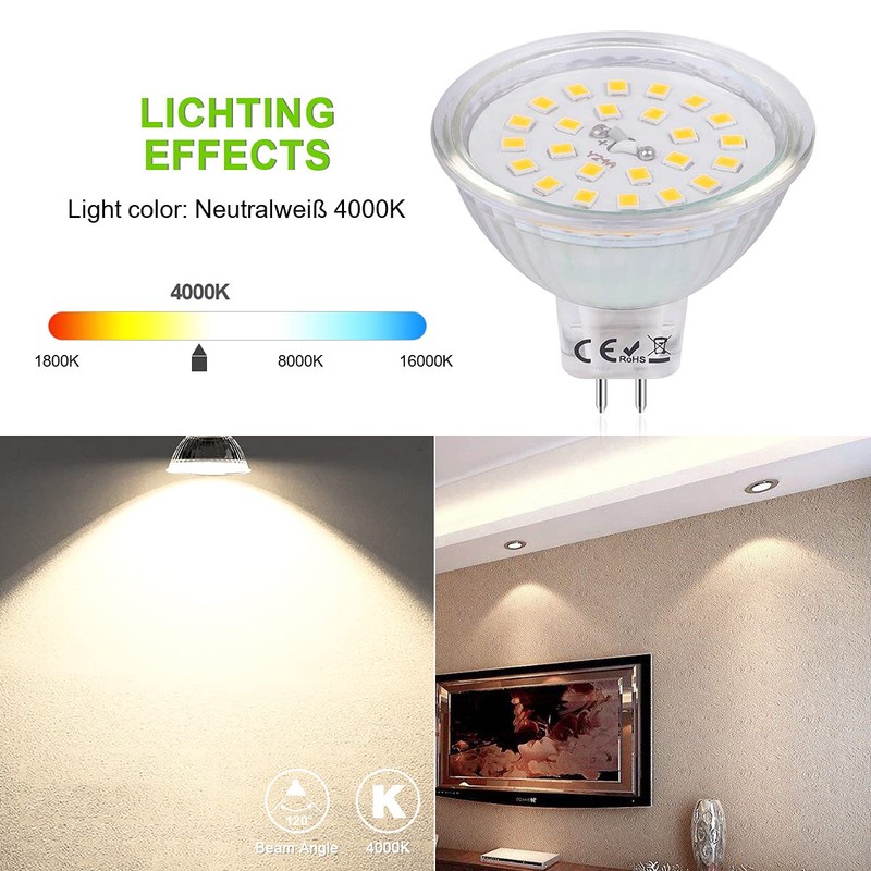 - ✔ Pack of 6 MR16 GU5.3 LED spotlights, 4000 K neutral white, 120° beam angle, 12 V AC/DC, not dimmable.